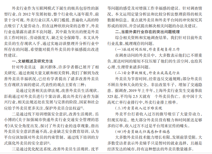 本文从外卖员的生存现状入手,探讨影响外卖员幸福感的因素,主要包括工作时长、交通安全、工资待遇、精神生活等。为提升外卖员幸福指数,外卖员加强自身素质、外卖平台改善系统、政府科学指导、民众改善态度等都极其重要。