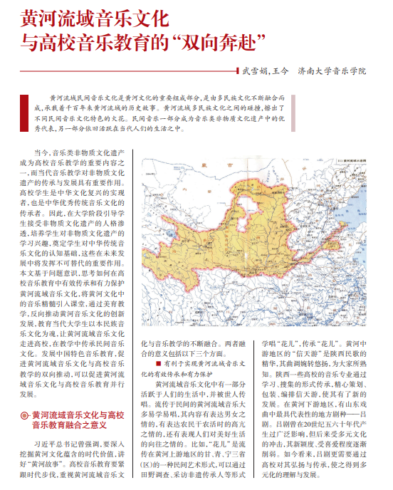 黄河流域民间音乐文化是黄河文化的重要组成部分,是由多民族文化不断融合而 成,承载着千百年来黄河流域的历史故事。黄河流域多民族文化之间的碰撞,擦出了 不同民间音乐文化特色的火花。民间音乐一部分成为音乐类非物质文化遗产中的优 秀代表,另一部分依旧活跃在当代人们的生活之中。