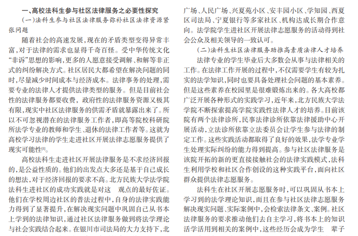 高校法科生参与社区法律服务,是提高法律学生法学素养、提高服务社会意识、解决社区法律服务供需矛盾的重要形式。本文以北方民族大学法学院学生的社区法律服务实践为研究样本进行实证研究,探寻法科生让社区普法“活”起来的新思路。目前高校法科生进社区开展法律服务存在不少现实问题:缺乏切实的政策支持,财物支持不够,学生法学业务能力不高,法律服务形式传统老旧等。文章针对这些问题提出了相应解决建议,以期为推动法科生社区法律服务“活”起来提供路径参考。