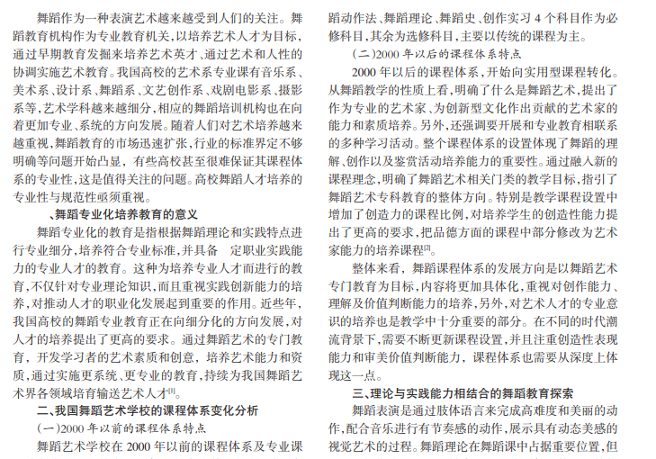 现今艺术教育的重点是技能教育,就是通过专业知识或技术,培养适合各领域需要的专业人才。舞蹈作为一种表演艺术,舞蹈专业教育应以专业知识为基础,以开发人才的潜能为目标,舞蹈人才需要专业化培养,舞蹈教育需要形成规范的体系。本文就高校舞蹈专业化培养教育的课题进行探讨。