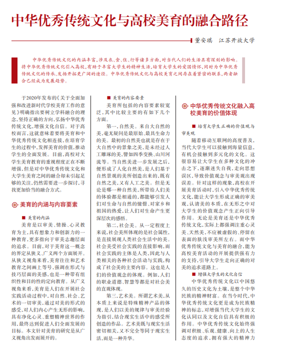 中华优秀传统文化的内涵丰富,涉及衣、食、住、行等诸多方面,对当代人们的生活具有深刻的影响。 将中华优秀传统文化引入高校,有助于丰富大学生的精神生活,培育大学生的爱国情怀,同时为中华优秀 传统文化的传承、发扬开拓更广阔的途径。中华优秀传统文化与高校美育之间存在着紧密的联系,两者融 合已经成为发展趋势。