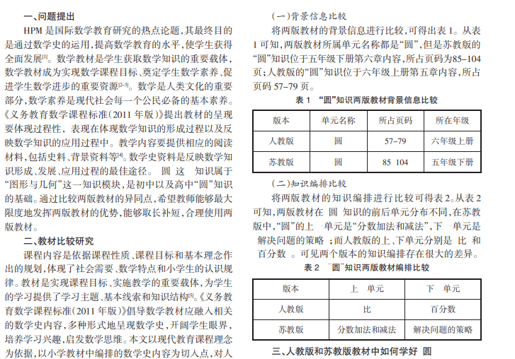 本文在 HPM视角下以人教版和苏教版教材为研究对象,以“圆”知识为例,从两版教材的背景信息、知识编排、知识呈现方式、知识背景四个维度进行比较分析。通过分析比较发现两套教材的数学史分布存在很多异同之处,建议实施两版教材的教师能够整合它们的共同优势,发挥两版教材的优势。