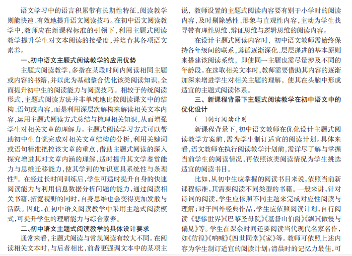 本文详细介绍了初中语文主题式阅读教学的应用优势与设计要求,通过专业研究与调查,精准找出新课程背景下主题式阅读教学在初中语文中的优化设计方案,如制订阅读计划、厘清授课时间、加强课外阅读、凝练阅读主题及丰富阅读内容等,从而提升初中语文阅读教学效果。
