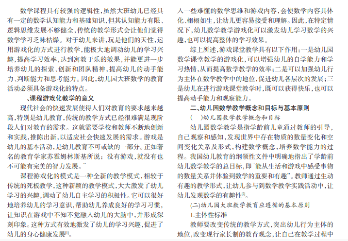 幼儿园数学教育与游戏化的有机融合,对幼儿园课程实施转化为具有游戏特征的教育教学具有非常重要的意义。教师运用丰富多彩的教学内容和形式各样的教学方式来满足幼儿的求知欲,解放幼儿的天性,培养幼儿的数学逻辑思维能力是幼儿园数学教学的最佳途径。本文从提前做好大班数学教学游戏化准备工作、做好游戏教学的实施、在游戏中增加互动性等方面提出了优化幼儿园数学教学的实施策略。