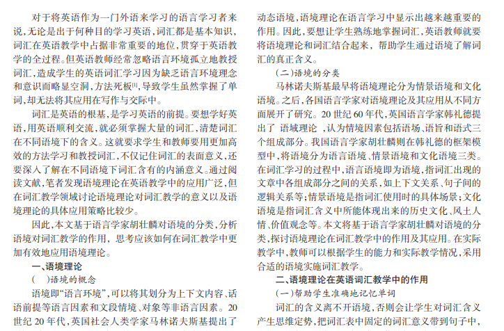 “语境”这一概念最早是由英国人类学家马林诺夫斯基在 1923年提出来的。在不同的语境之中,同样的英语单词往往有不同的意义。依托语境学习英语词汇,可以使学习者精准了解词语的含义。对于英语学习者来说,词汇是基本的东西,由词到句,由句到篇。掌握好词汇是学习者利用英语进行交际的重要前提。英语词汇不是一个个单词的罗列,而是在不同的语境中,有不同的含义。本文旨在基于语境的分类,分析语境在词汇教学中的作用,探究语境理论在英语词汇教学中的应用策略。