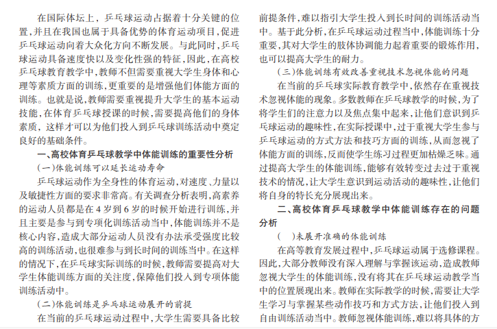 随着时代进步与经济发展,我国高等教育事业得以不断发展。在这样的新形势下,高等教育在我国现代化教育体系当中占据重要的位置,而指引大学生参与到具体的乒乓球运动当中也非常重要,也可以提高他们的身体素质。因此,在当前的高等院校体育乒乓球教育教学的过程当中,教师需要指引大学生投入到具体的体能训练活动中,有效提高他们的身体素质以及训练水平,这对推动他们的整体发展十分关键。基于此,本文主要是针对高校体育乒乓球教学中体能训练展开探究分析,以此为有关研究提供合理参考。