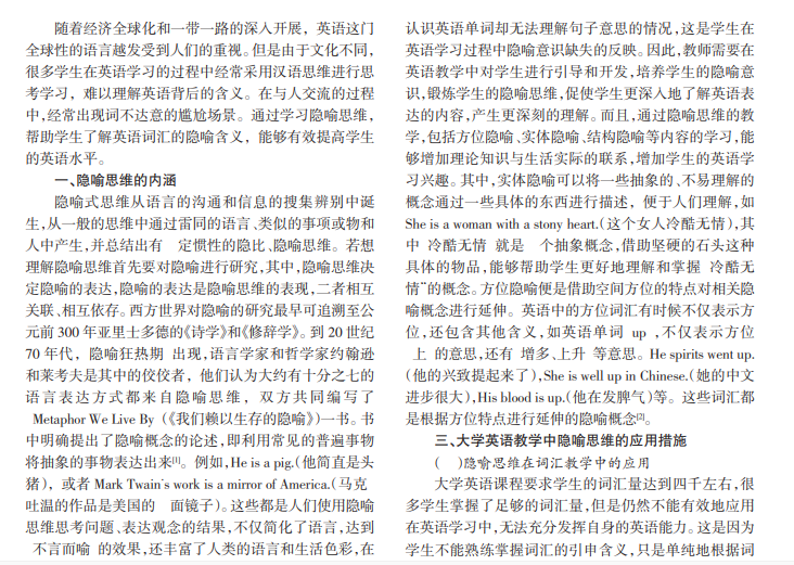 隐喻思维是一种认知思维方式,它融合在人们生活和学习的方方面面,与文化和语言有着不可分割的联系。如何在大学英语教学过程中应用隐喻思维提高学生的英语水平,是英语教师重点研究的课题。本文对隐喻思维在大学英语教学中的应用进行了探究,以期提高学生的隐喻思维和对英语的理解运用的能力。
