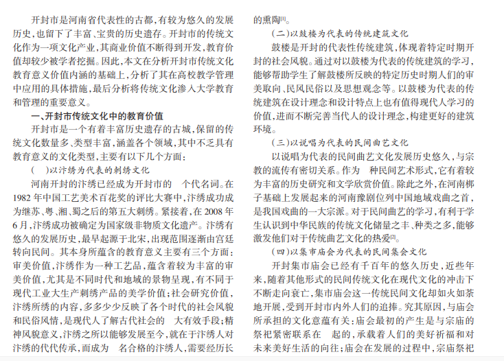 中华民族文化是一座座城市在其发展过程中长期积淀和留存下来的瑰宝,然而学者们往往过多地从整体范畴上讨论中华文化,忽视了每座城市自身传统文化的独特性。此外,人们对于传统文化价值的探索只局限于商业开发和思想教育,鲜有与高校教学管理结合起来,而这正是现代社会需要关注的。