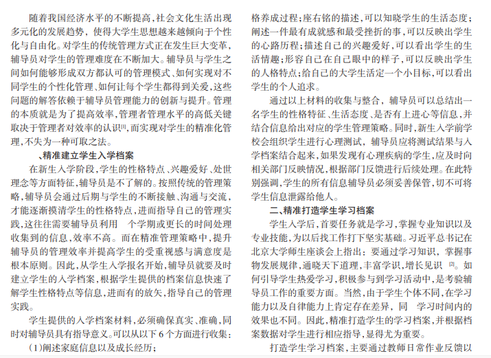 高校辅导员是高等学校对学生进行专业管理的人员,他们对学生进行专门的教育引导。然而高校学生有自己的个性心理、行为性格、学习能力和兴趣爱好,面对众多学生,辅导员如何快速了解学生、对学生进行归类、实现精准高效的管理,是值得细细研究与探索的。
