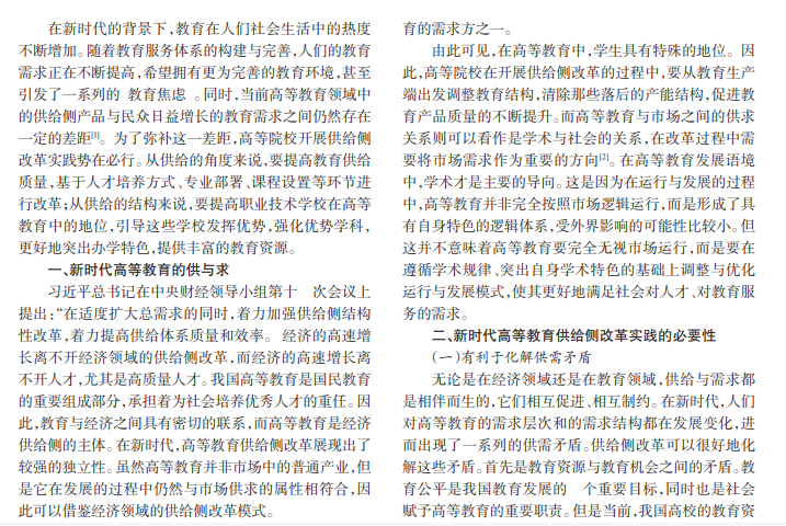 供给侧改革本是经济领域的一个概念,是新时期党中央结合我国现阶段经济发展状况所提出的创新性举措。供给侧改革的目的是优化资源配置情况,从整体上改善当前的投资环境。教育与经济之间具有密切的联系,教育的发展会受到经济政策的影响,供给侧改革的理念已经延伸到了高等教育领域。当前,高等教育已经形成了政府政策链、社会支持链以及高校服务链这三个供给链,它们相互依托、相互关联。在改革实践的过程中,基于这三个供给链,政府、社会以及高校得以发挥应有的作用。
