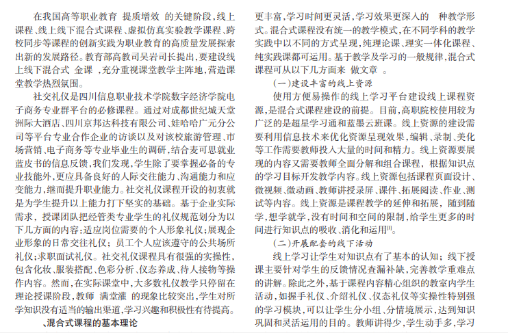 本文依据电子商务专业群人才培养目标的要求,以专业平台课程社交礼仪作为研究对象,设置适应电商专业群人才社交需求的课程内容,按照混合式课程建设目标重构课程体系,分三阶段六环节实施线上线下混合式课程教学改革。