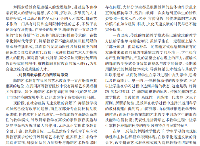 在新媒体技术飞速发展的数字化背景下,高校应改革创新舞蹈教学模式。本文结合舞蹈传统教学模式现状以及数字化背景给舞蹈教学模式带来的影响和要求,探讨如何在数字化背景下创新舞蹈教学模式,进而促进舞蹈教育的进步与发展,以满足人们日益增长的精神需求。