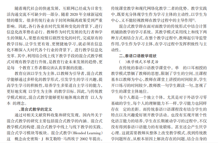 混合式教学充分体现了现代化信息技术在教学领域运用的特点,利用线上网络学习与线下面对面教学的优势互相结合,进一步提升学生的学习兴趣,在口语课程中使用混合式教学模式,给学生创造开口说的机会和平台,让学生能更好地进行口语训练,方便学习交流,充分发挥学生的学习主动性。本文对如今大学泰语口语课堂教学现状进行简要分析,并对混合式教学在泰语口语课堂教学环节的设计进行了初步研究,针对如何打造混合式教学课程提出了几点建议。