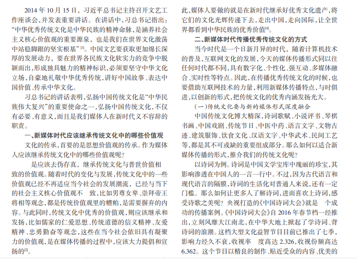 传统文化是中国的软实力,媒体人应继承和发扬传统文化的优秀价值观,努力创新,积极传播传统文化,与新媒体形式深度融合,保持敏锐的营销意识,打造“传统文化品牌”,给世界讲好中国故事。