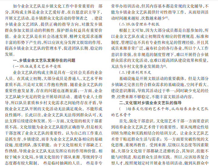 文化馆作为社会群众文化事业单位,不仅能为社会群众提供文化娱乐的物质场所,还能开展各项文化娱乐活动。其具有文化性和公益性,能够完善我国乡村公共文化服务体系,满足乡村群众的文化需求、提高群众的思想道德水平,缓解乡村群众日益增长的生活需求与精神文化需求之间的矛盾,促进我国社会主义文化繁荣发展,从而推进乡村振兴战略。乡镇业余文艺队是乡村公共文化服务体系中非常重要的一股力量,也是群众文化的中坚力量,能够促进乡镇文化繁荣发展。因此,如何充分利用文化馆力量,为乡镇业余文艺队提供正确的方向指导,是我国现阶段开展乡村公共文化事业的关键,也是乡村文娱工作者研究的重点课题。