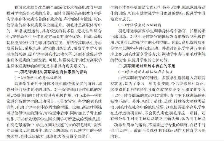 羽毛球是一项综合性、竞技性和全身性较强的运动,对运动者的身体素质具有较高的要求。同时,羽毛球具有操作简单、容易上手等特点,受到广大高职学生的喜爱。目前,多数高职院校都开设了羽毛球训练课程,但在实际训练中,却普遍存在重技能轻素质的现象,导致羽毛球运动促进学生身体素质发展的重要价值未能得到体现。对于这一问题,高职院校必须予以重视,通过对羽毛球训练理念和方式的优化,有效提升学生身体素质,促进学生全面发展。本文主要对羽毛球训练对高职学生身体素质的影响及策略进行了简要分析,希望能够给相关人员带来一些启示。