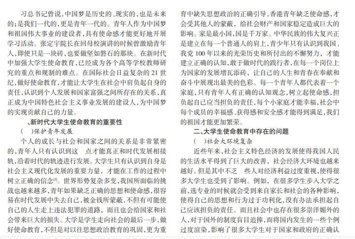 少年强则国强。在新时代背景下,加强大学生使命教育是我国教育中的重要工作。随着我国经济的不断发展,社会中的多种思想浪潮使得大学生很可能对于自身发展处于迷茫的状态,我国高校大学生的思想政治教育也面临着巨大的挑战。我国高度重视大学生使命教育的开展,并采取了一系列措施进行规范,取得了非常显著的效果,但是其中也存在着很多问题,迫切需要进行改善。本文针对新时代大学生使命教育进行分析,并结合大学生的发展现状,提出几条加强学生使命感的策略,以期为大学生政治教育提供借鉴。