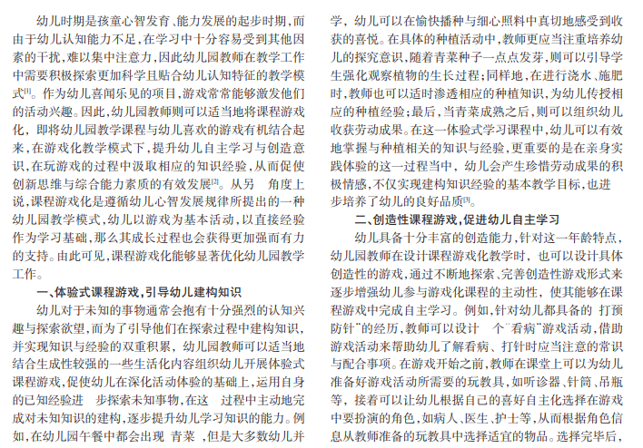 幼儿教育是增长幼儿见识、帮助幼儿认识世界、奠定学习能力基础的关键阶段,在幼儿园教学工作中,教师需要善于强化幼儿学习体验,帮助幼儿开发思维,从而有效地促使幼儿在幼儿园教学过程中吸收更多的知识,并锻炼良好的实践能力。基于此,课程游戏化是十分理想的幼儿教学模式,在游戏中完成教学课程,实现寓教于乐,促使幼儿健康快乐地学习与成长。本文主要分析课程游戏化在幼儿园教学工作中的应用策略。