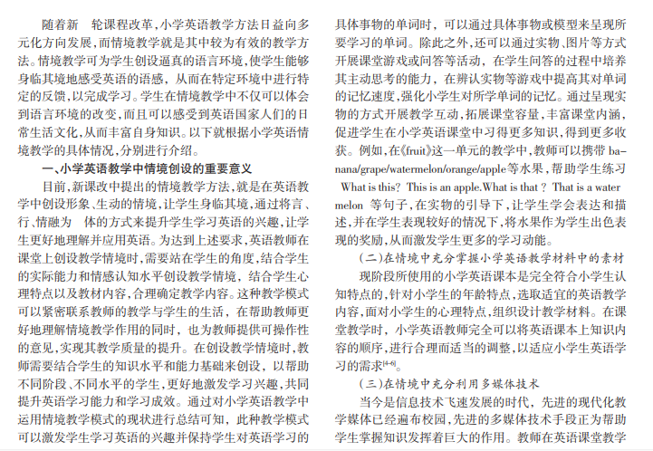 小学英语教学是基础教育中重要的一部分,这就要求教学工作者在实际工作中找到正确的方法,学习情境教学的方法,以自己的实际情况来完善情景教学的方法,充分利用情境教学进行小学英语教学,不断提升学生兴趣,提高教学质量。为教学方案创建“有趣场景”,让学生感觉处在一个英语学习的世界里,英语氛围浓厚。学生在一种轻松愉悦的环境中学习,养成良好学习习惯,为学生以后的全面发展打下基础。
