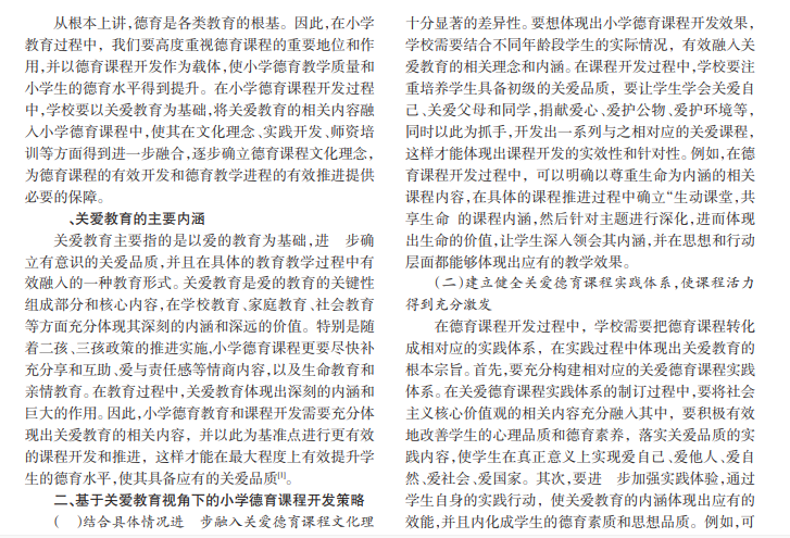 当前,在教育教学体制不断深化改革的背景下,小学德育教育更加关注关爱教育等相关内容,并以此为着手点,使小学德育课程得到有效改进和优化,实现更科学合理的开发,进而为学生德育素养和德育教学水平的有效提升提供必要的支持。本文以关爱教育视角为基础,重点分析了有效开发和优化小学德育课程的实施策略等相关内容,希望能够为小学德育课程的有效推进和学生德育教学质量的有效提升提供一定的参考。