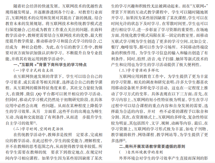 自 20世纪 70年代改革开放政策实施以来,我国经济得到了迅速发展。与此同时,各项科学技术飞速发展,取得的成就越发突出。其中,表现最为明显的便是“互联网 +”和各种信息化技术的发展。对大学生而言,在“互联网 +” 背景下,学习方式、生活方式都出现了较为明显的变化。在具体教学活动中,教师如果仍然采用较为传统的教学方式,已经很难满足学生成长的需求。在此背景下,双语课程混合学习教学模式出现了。将其运用到商科教学工作中,可以有效提升课堂效果,促进学生的全面发展,提升教学质量。