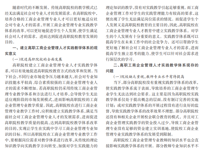 高职院校开设工商企业管理专业的主要目的,是培养专业知识技能水平较高、综合素质较强的工商企业管理人才。基于此,本文首先概述了建立高职工商企业管理人才实践教学体系的现实意义,然后针对现阶段教学体系中存在的问题进行分析,并提出相应的解决措施,希望对我国高职院校工商企业管理专业的发展提供一定帮助。