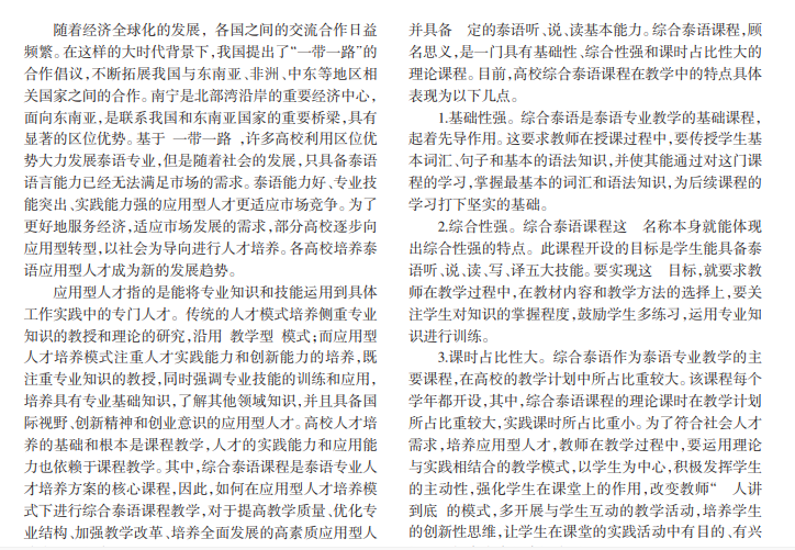 在“一带一路”背景下,中泰两国的往来更加频繁,社会对泰语人才的需求更倾向于应用型、复合型人才。因此,高校针对核心课程———综合泰语的教学改革势在必行。本文根据学生层次,结合实际教学活动,从课堂组织形式、课堂教学方法等方面对综合泰语课程改革进行探讨,并提出相应的建议和对策,以期给课程改革及培养具有实践和创新能力的应用型人才提供参考。