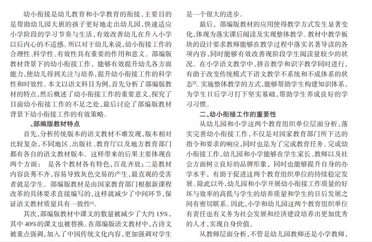 在我国教育改革的稳步推进下,核心素养这一概念被提出并应用于教育实践中。教师不仅将核心素养看作教育的重点目标和任务,同时也将核心素养作为做好幼小衔接工作的重要标准及基本原则。部编版教材是由教育部组织编写的,由人民教育出版社出版,在 2016年经过几个地区的试用后,于 2017年 9月被应用于全国义务教育阶段的中小学课堂中,应用科目为语文、历史及道德与法治。不可否认,在应用部编版教材和核心素养理念落实的背景下,学校和教师都发生了较大的转变,而这也使幼小衔接工作的工作内容和工作形式有了创新。