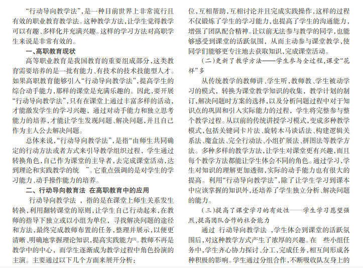 对高职教育来说,教学中如何培养和建立学生的职业行动能力是一门需要永久研究的课题。提高学生的课堂参与感,进行角色互换,是目前高职教育比较受欢迎的一种教学方法。这种教学方法,被称为“行动导向教学法”。