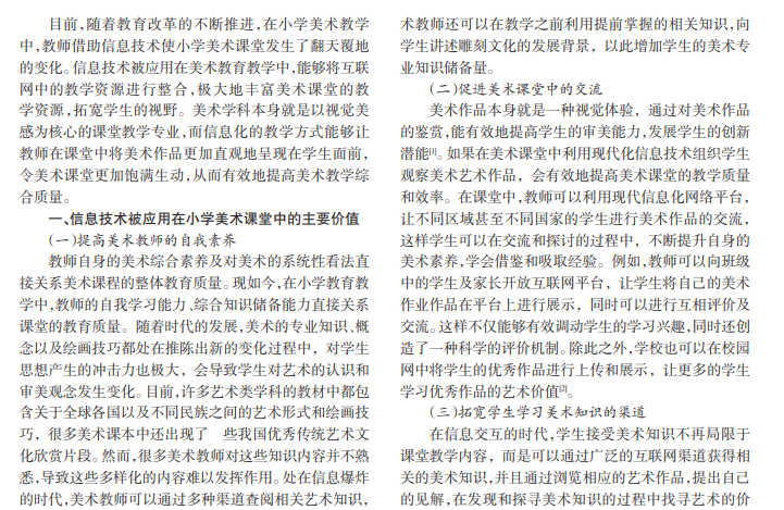 近年来,国家在教育方面更加注重培养学生德、智、体、美全面发展。美术教育作为艺术教育的科目之一,在小学阶段培养学生核心素养的过程中发挥了相当重要的作用。美术学科本身就具有高度的艺术气息,使学生能够在教师的引导下,提升审美能力,同时激发创作潜能,对于学生的成长和发展具有不可替代的作用。而信息技术的发展为传统的美术课堂实现转型和变革带来巨大的推动力。本文主要阐述信息技术被应用在小学美术教学中的重要价值,并分析了信息技术在小学美术教学中的具体应用方法,希望能够为不断提高学生的美术综合素养提供参考。