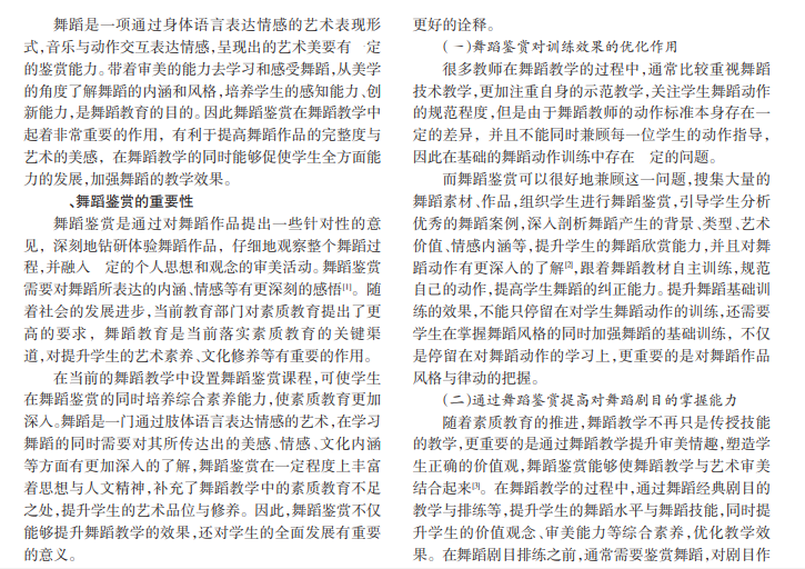 舞蹈鉴赏是舞蹈教学中非常关键的组成部分。在舞蹈教学中只有真正发挥舞蹈鉴赏的价值,才能开展更加深入的教学,提高学生的舞蹈学习能力,提高舞蹈教学的质量。本文结合舞蹈鉴赏的重要性分析舞蹈教学中舞蹈鉴赏的应用价值,提出提高学生舞蹈鉴赏能力的建议。