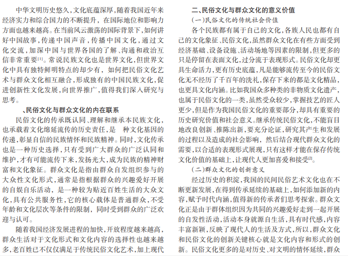 以民俗文化为探索视角,详细阐述民俗文化的传承发展与群众文化发展的相互联系,以及对促进群众文化发展的重要作用,指出民俗文化与群众文化之间的共通性和内在联系,探讨民俗文化的社会价值意义,探索促进民俗文化与群众文化共同繁荣发展的实现路径。