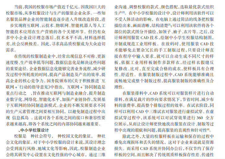 服装应用型软件改变了服装行业设计、技术部门的作业方式,将传统手工转换成为电脑数字化、智能化作业。二维款式设计软件改变了手绘设计模式。本文从电脑设计入手,结合使用服装 CAD、CorelDRAW 等软件以及CAM、 MES、ERP等制造系统,使中小学校服在设计、制造等方面有效协同,使资源能够得到充分利用。