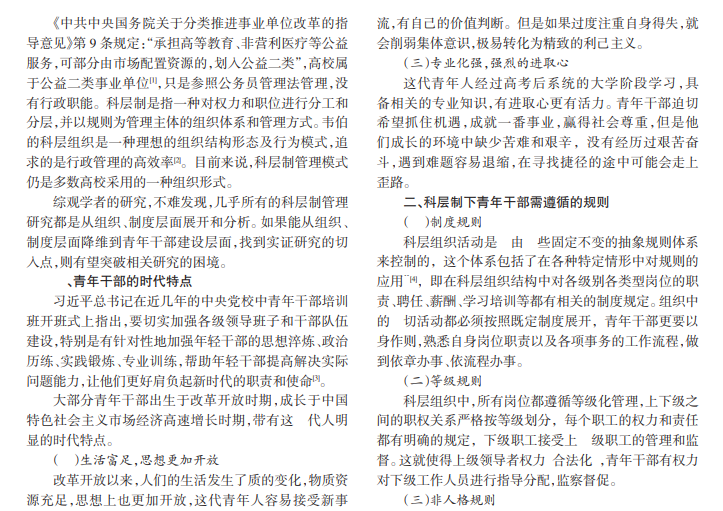 目前来说,科层制管理模式仍是多数高校采用的一种组织形式,青年干部有独特的时代特点,科层制下需遵循特定规则。本文从高校青年干部建设面临的问题和难点出发,探索突破的路径和方式,提高青年干部工作效率,推动现代高校的可持续发展。