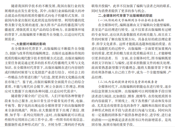全媒体时代已经到来,并且渗透于生活的各个领域,我国出版编辑行业也受到了一定程度的冲击,对出版编辑人员的工作提出了更高的要求。鉴于此,本文从大数据对编辑的影响、全媒体时代背景下出版编辑的职能以及全媒体时代背景下出版编辑创新途径这三个方面对编辑职能创新进行探析。