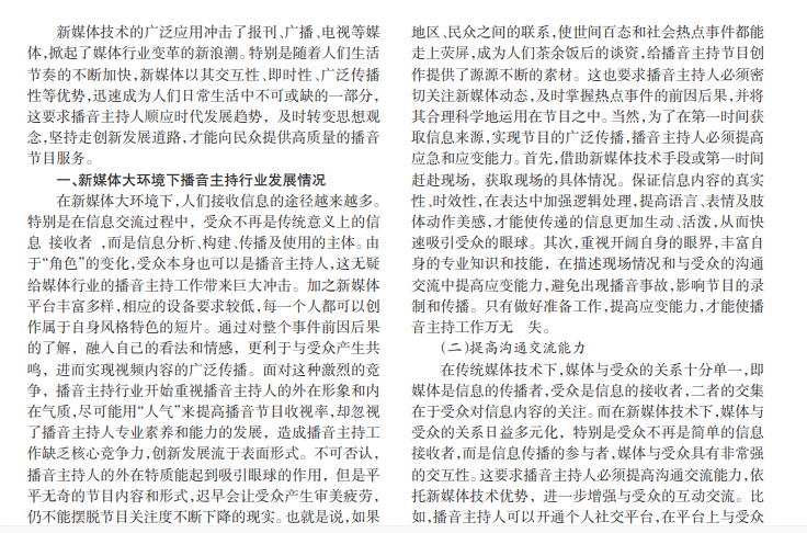 随着经济社会的高速发展和科技水平的不断进步,互联网技术已深入人们的日常生活,进一步丰富了人们获取信息的途径和手段,这无疑给播音主持工作带来巨大挑战。在这样的时代发展形势下,播音主持人应深刻认识创新发展的重要性,积极迎合受众的心理诉求,锤炼自身的专业素养和能力,提高对新节目形式的适应能力,并快速形成独特的播音风格,才能吸引受众的眼球。文章以新媒体大环境为视角,分析与探讨播音主持人创新发展趋势,希望能对播音主持人工作提供一些参考。
