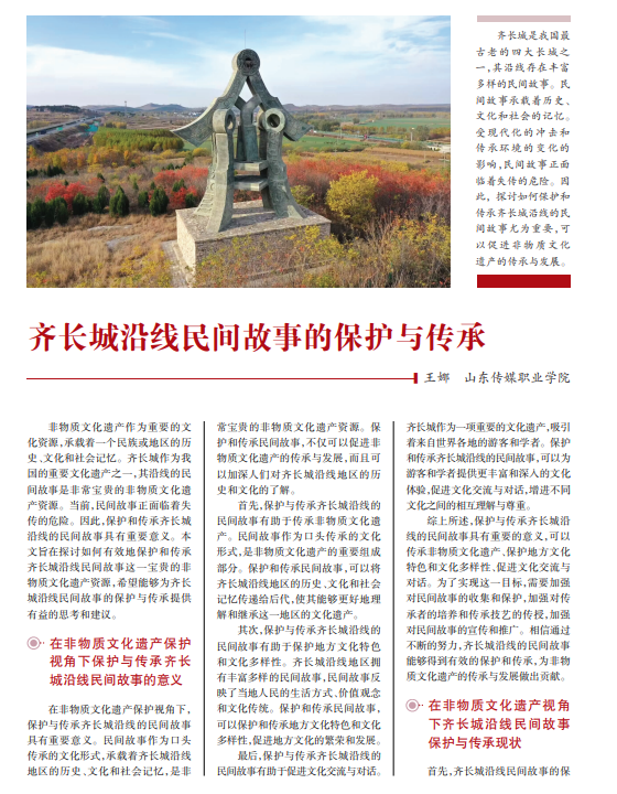 齐长城是我国最 古老的四大长城之 一,其沿线存在丰富 多样的民间故事。民 间故事承载着历史、 文化和社会的记忆。 受现代化的冲击和 传承环境的变化的 影响,民间故事正面 临着失传的危险。因 此,探讨如何保护和 传承齐长城沿线的民 间故事尤为重要,可 以促进非物质文化 遗产的传承与发展。