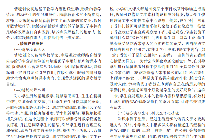 新课标要求营造学生参与度高的高效率教学环境,这一点在小学语文教学中得到良好体现。小学语文具有文章种类多、写作范围广的特点,可以很好地满足小学生的求知欲。要将小学语文的特点充分发挥出来,教师需要营造积极、活跃的教学课堂,创设情境是最佳教学手段之一,能够以各种生动的教学情境激发学生学习兴趣,提高课堂 “活”性。