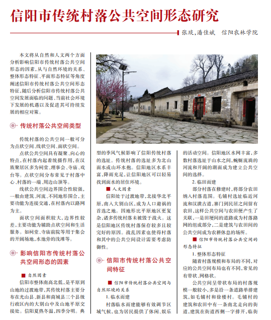 传统村落保护与开发是推进宜居宜业和美丽乡村建设的重要举措。传统村 落中的公共空间相较于家庭宅院空间,更具社会交流属性,以无声的方式讲述着 村落营造至今的社会关系和村落文化。细化传统村落的公共空间研究,有利于研 究传统文化,便于其后续开发。