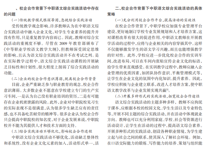 现代职业教育的最终目标是向社会输送复合型的技能人才,这也体现了职业教育的技术性和操作性特点。从近几年人才培养多元化的趋势来看,职业学校与企业之间的联系越来越密切,推动教学改革的进程。综合实践活动作为中职语文课程的重要组成部分,对提高学生专业素养与综合能力具有重要作用。以校企合作的方式开展语文综合实践活动,能够满足学生自身职业的发展和企业的发展目标,对培养学生职业情感和人生理想具有指导意义。