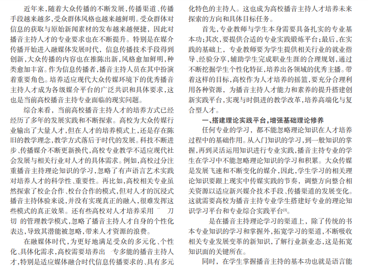 近年来,大众传播步入融媒体不断发展、变化的时代,高校播音主持专业需要及时评估、调整对专业学生的培养方式,结合融媒体大环境下信息传播的主要特征,大胆创新人才培养方式,转变观念,结合新时代对播音主持人才的要求实施教学。其中,积极搭建创新平台成为培养播音主持人才的一个重要渠道。本论文结合当前高校播音主持教学及时代背景下融媒体发展的现实环境、具体要求,从搭建播音主持专业理论学习平台、社会实践平台、个性化发展等多个平台角度,综合讨论和分析高校、社会、播音主持专业师生利用创新平台提升专业能力与素养的对策和具体方式,推动高校播音主持专业理论教学与相关实践活动高质量发展。
