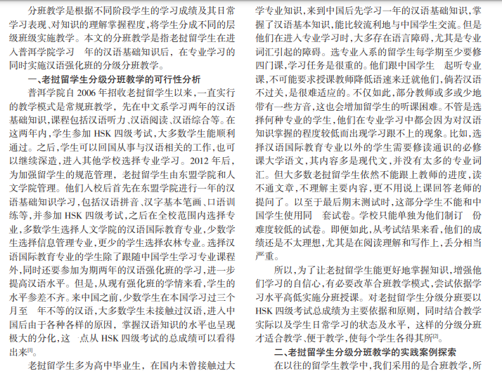 对老挝留学生实施的分班教学培养模式应以学生在实际学习中对汉语知识的掌握程度为依据。本文以汉语国际教育专业老挝留学生分级分班教学为研究范例,分析分级分班教学的可能性,并以汉语阅读课为例进行案例的实践与探索,在取得初步成效的基础上,提出汉语国际教育专业老挝留学生分班教学培养模式的可行性,为实践教学提供参考依据。