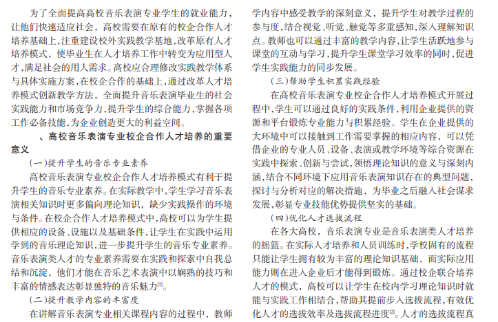 校企合作是高等院校人才培养的重要模式,如今就业竞争激烈,应进一步强化高校学生的就业意识。对于高校音乐表演专业的毕业生来说,由于环境的突然转变,可能会出现短期无法适应的情况。为了满足当前社会对高校音乐表演专业毕业生的人才需求,高校需要采用校企合作培养人才模式,培养专业化应用型人才,推进实践性教学的全方位应用。目前高校校企合作人才培养模式在整体实践过程中仍然有待加强,改革校企合作模式迫在眉睫。本文深入探究高校音乐表演专业校企合作人才培养模式中存在的不足,并提出解决策略,以使校企合作在实践中得到改善。
