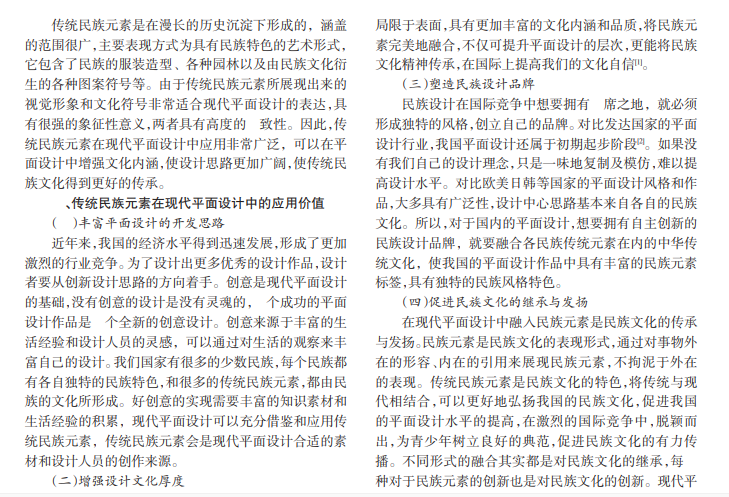 随着民族文化的不断传播和发展,传统民族元素在现代平面设计中得到了广泛的应用,不仅在于设计文化深度的增强,也在于增强设计作品中的文化感染力,在于促进民族设计品牌的发展,在世界平面设计中获得更高的竞争力。本文通过对传统民族元素在现代平面设计中的应用进行探究,对实际应用过程中存在的问题进行分析,提出建议和措施,立足于传统文化,促进民族元素的传播与发展。