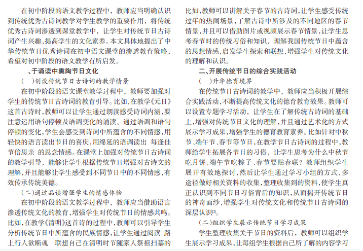 当前,新课程教学标准和素质教育理念不断深入,对初中阶段的教学工作提出了新的要求。教师在展开初中语文教学过程中,应当积极地借助传统节日的优秀诗词为学生渗透传统文化,不断提高学生的语文素养,同时做好传统文化的传承教育工作。本文主要针对中华传统节日优秀诗词走进初中语文课堂的策略展开研究分析。