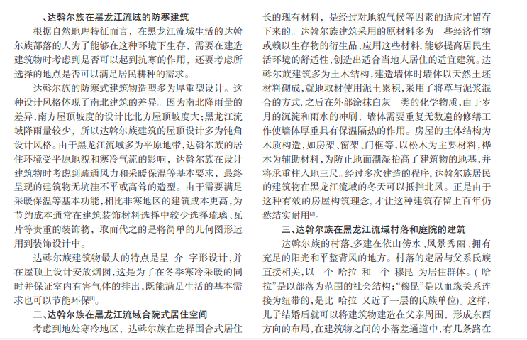 房屋建筑是人类物质文化的一种象征,鲜明地反映着不同民族的经济发展状况和他们生活方式的特点。达斡尔族居民长期生活在黑龙江和嫩江流域,主要从事农业和畜牧业。黑龙江流域地形以平原为主,气候为季风气候,较为寒冷,土质以黑土地为主。在这种特定的自然地理特征影响下,东北达斡尔族的居住建筑设计展现了与东北地域风貌相符合的特点。本文主要围绕达斡尔族建筑艺术在黑龙江流域的应用进行研究,简要介绍了他们的村落设置和庭院情况。