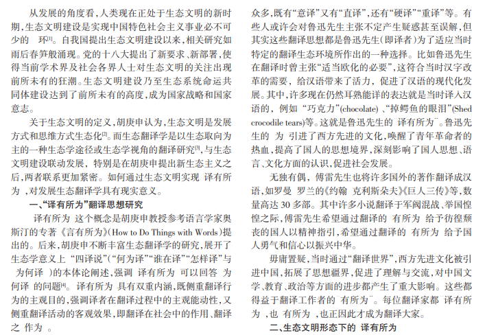 21世纪是“生态文明新时代”,在此背景下,将中国生态翻译学与中国生态文明建设相结合,将为生态翻译学理论提供新机遇,促进其国际化进程;同时也有助于传播中国生态文明思想,加强中国乃至世界的生态文明建设。为此,笔者梳理了“译有所为”翻译思想研究并基于生态翻译学视角,分析在生态文明形态下“译有所为”的动因(即“为” 何)和实现“译有所为”的方法(即何“为”)。