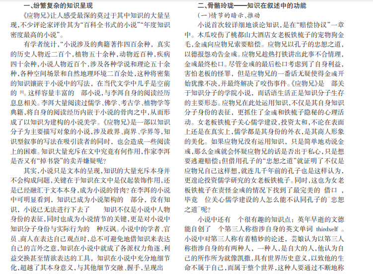 李洱小说《应物兄》容纳了儒学、佛学、医学、植物学、考古学等众多知识,将知识与小说叙事相融合,成为一部“百科全书式”的小说,建构了新的小说美学。本文从《应物兄》中的“知识”出发,对“知识”作总体性阐释,具体分析“知识”在小说中对情节的推动、暗示及其构成的反讽效果,并分析“知识”对于 20世纪 80年代以来 30多年时代问题的回应。