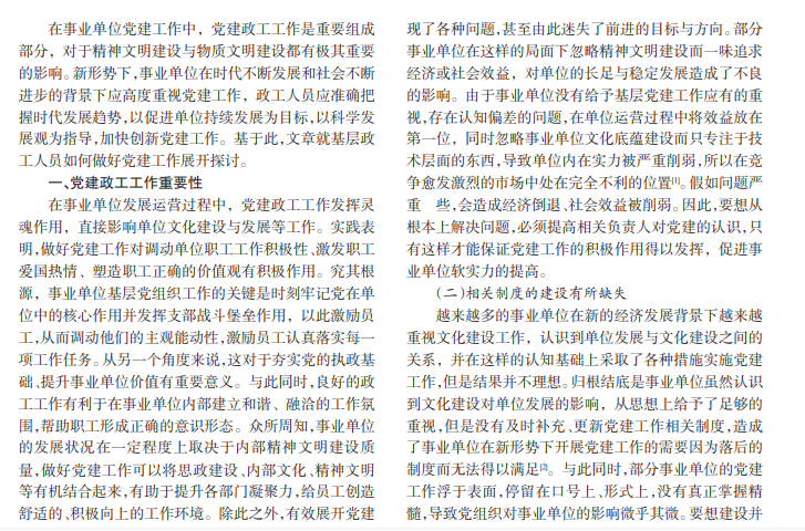 通过文献查阅、实地调研、经验总结等方法就基层政工人员做好党建工作进行探讨。研究结果表明,当前基层党建政工工作现状不容乐观,存在的问题较多,包括对党建工作重视程度不够、相关制度的建设有所缺乏、政工人员综合素质偏低等,这些问题对党建工作的有效开展造成严重阻碍。基于此,文章立足实际,就基层政工人员如何在新时代下做好党建工作提出几点建议:针对党建工作给予足够的重视;建立并不断完善单位党建制度;加强对基层政工人员的培训。