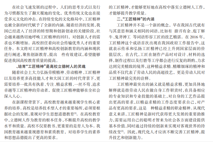 随着新课程改革和素质教育的推进,高校的教育理念和教育方式都得到了很大的改变。高校不仅要传授学生专业知识,还需要培养学生的核心素养,把“立德树人”作为高等教育的根本任务和重要目标。在“立德树人”视域下,工匠精神是高校“立德树人”的灵魂。当今时代,创新是时代发展的必然趋势,为了能够提高高校毕业生适应社会环境的能力,在“立德树人”视域下还必须要培养和提升高校学生的创新创业精神和能力。由此可见,将高校创业教育与工匠精神的培育进行匹配融合,是时代的必然要求和社会发展的必经之路。